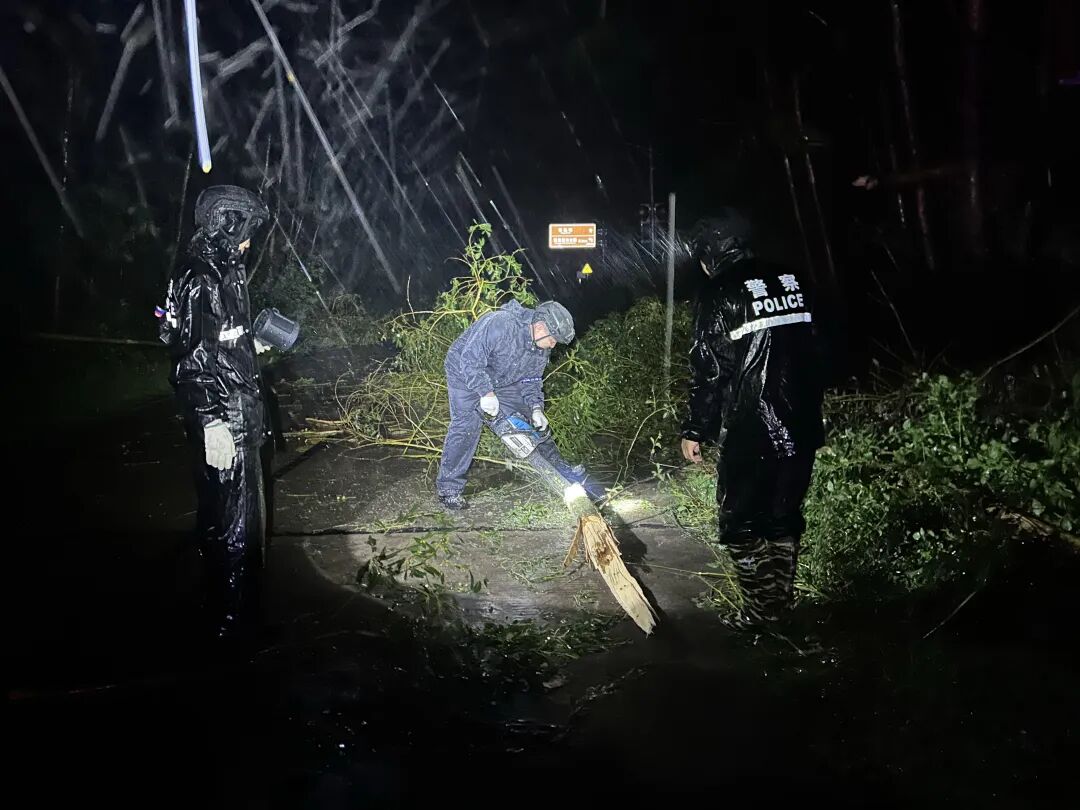 林林副縣長(zhǎng)帶隊(duì)青年民警突擊隊(duì)、機(jī)動(dòng)訓(xùn)練大隊(duì)和交管大隊(duì)等應(yīng)急力量,趕赴G207、G228等主干道,扶起狂風(fēng)吹倒的中間防護(hù)欄,鋸砍斷并移開倒在路間的樹木,支起倒下的廣告牌,在積水深路段樹立警示牌,筑起守護(hù)人民生命財(cái)產(chǎn)安全防線。