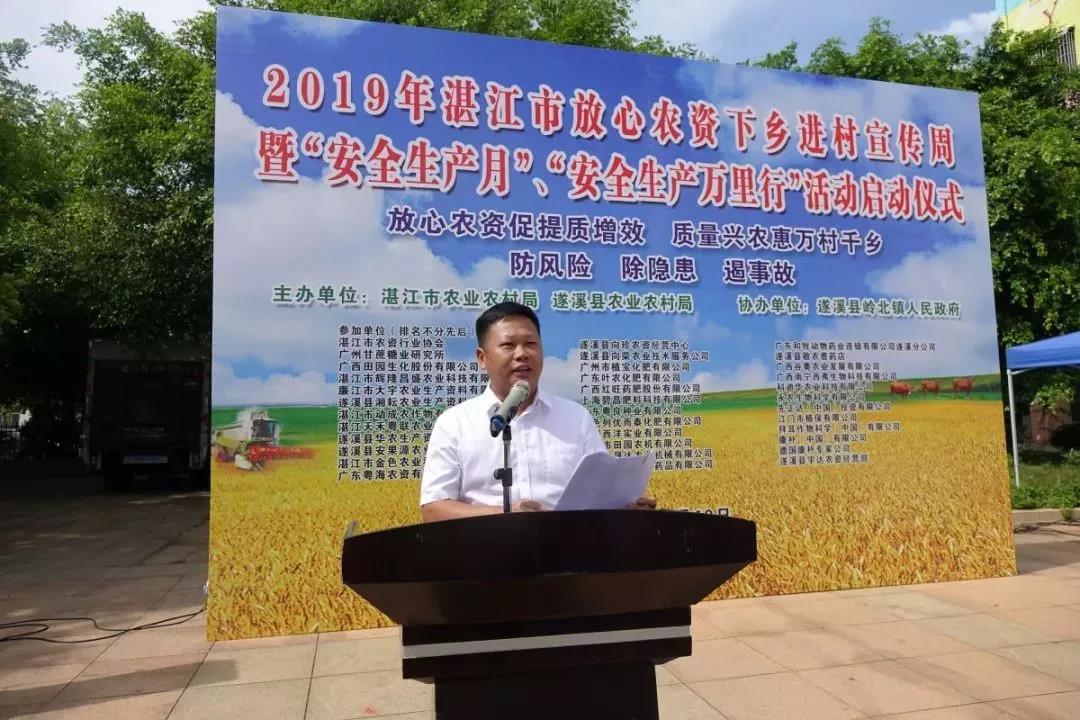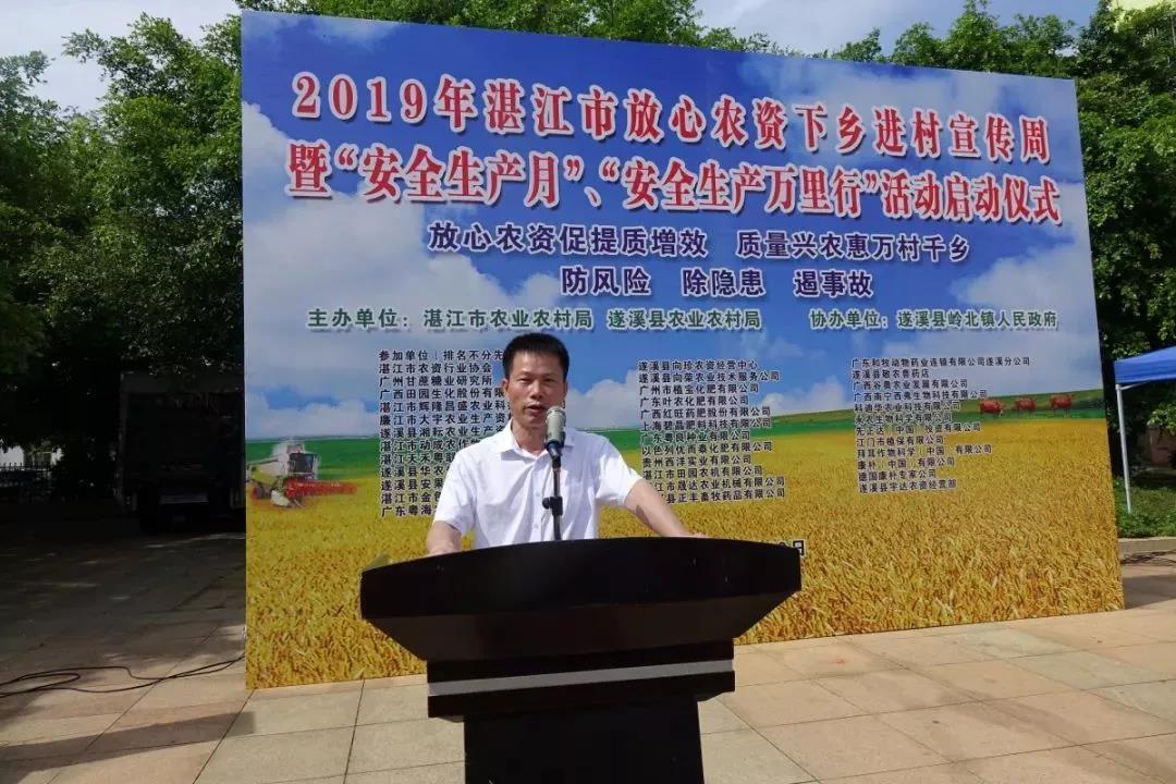 6月10日,由湛江市農(nóng)業(yè)農(nóng)村局和遂溪縣農(nóng)業(yè)農(nóng)村局主辦、遂溪縣嶺北鎮(zhèn)人民政府協(xié)辦的2019年湛江市放心農(nóng)資下鄉(xiāng)宣傳周暨“安全生產(chǎn)月”“安全生產(chǎn)萬里行”活動(dòng)在遂溪縣嶺北鎮(zhèn)舉行。湛江市農(nóng)業(yè)農(nóng)村局黨組副書記、副局長(zhǎng)張賢,遂溪縣農(nóng)業(yè)農(nóng)村局黨組書記、局長(zhǎng)、縣委農(nóng)辦(縣扶貧辦)主任李強(qiáng),遂溪縣嶺北鎮(zhèn)黨委書記王豐等參加活動(dòng)并作講話。