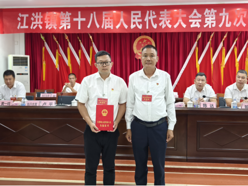會議依法選舉蔡思敏為江洪鎮(zhèn)人大副主席。江洪鎮(zhèn)人大主席盧平為蔡思敏頒發(fā)當(dāng)選證書。