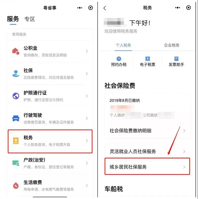 1. 在“粵省事”微信小程序首頁(yè)點(diǎn)擊“稅務(wù)”服務(wù),在個(gè)人稅務(wù)版塊找到“社會(huì)保險(xiǎn)費(fèi)”——“城鄉(xiāng)居民社保服務(wù)”,點(diǎn)擊“城鄉(xiāng)居民社保服務(wù)”。
