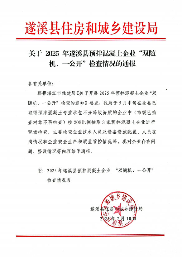 關(guān)于 2025 年遂溪縣預(yù)拌混凝土企業(yè)“雙隨機(jī)、一公開”檢查情況的通報(bào)