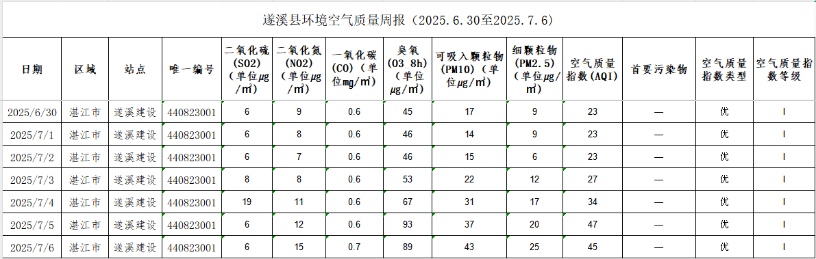 遂溪縣環(huán)境空氣質(zhì)量周報(bào)(2025.6.30至2025.7.6) | | 作者: | 來(lái)源:湛江市生態(tài)環(huán)境局遂溪分局 | 時(shí)間:2025-07-07 09:01:31 點(diǎn)擊數(shù):- 【打印正文】