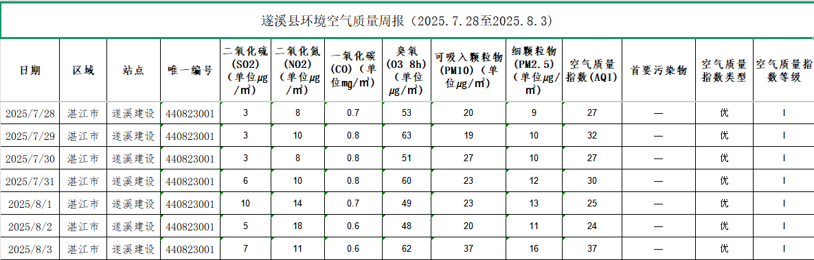 遂溪縣環(huán)境空氣質(zhì)量周報(2025.7.28至2025.8.3) | | 作者: | 來源:湛江市生態(tài)環(huán)境局遂溪分局 | 時間:2025-08-04 09:52:48 點擊數(shù):- 【打印正文】