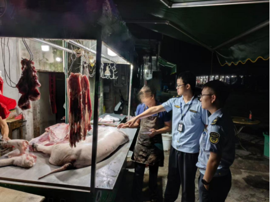 凌晨,靜謐的鄉(xiāng)村仍在沉睡,樂民農(nóng)貿(mào)市場的豬肉交易區(qū)已亮起燈火。“你好,請出示該豬肉的‘兩證兩章’。”執(zhí)法人員的聲音打破檔口的寧靜。