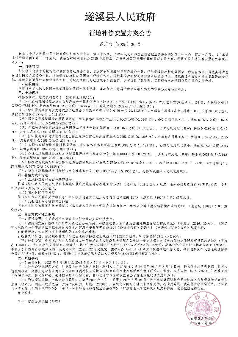 遂溪縣人民政府 征地補償安置方案公告 遂府告〔2025〕30號