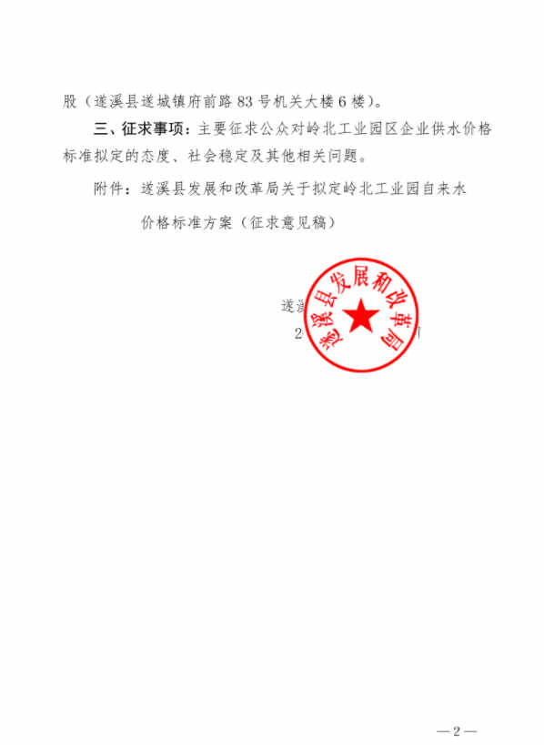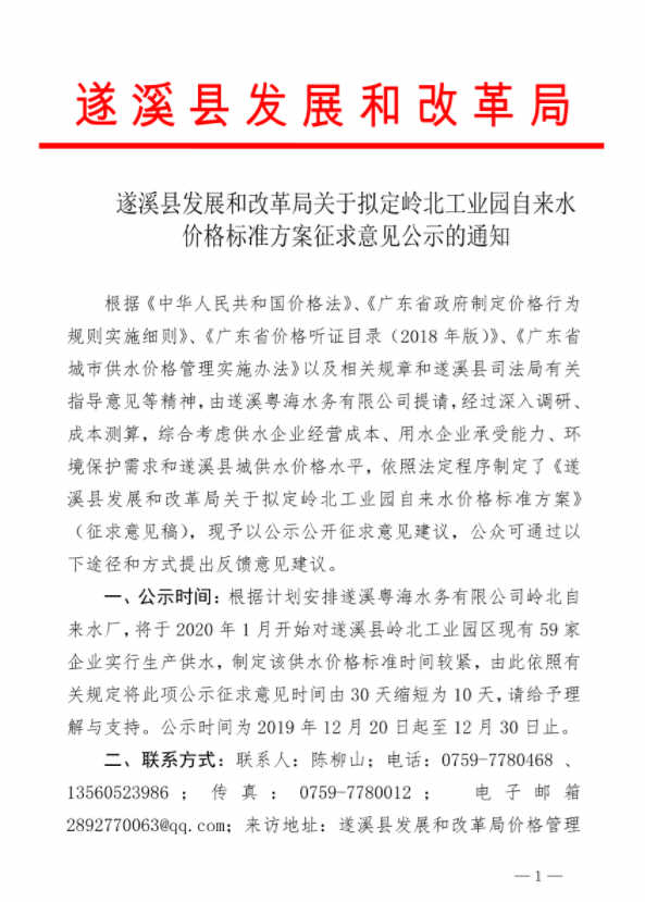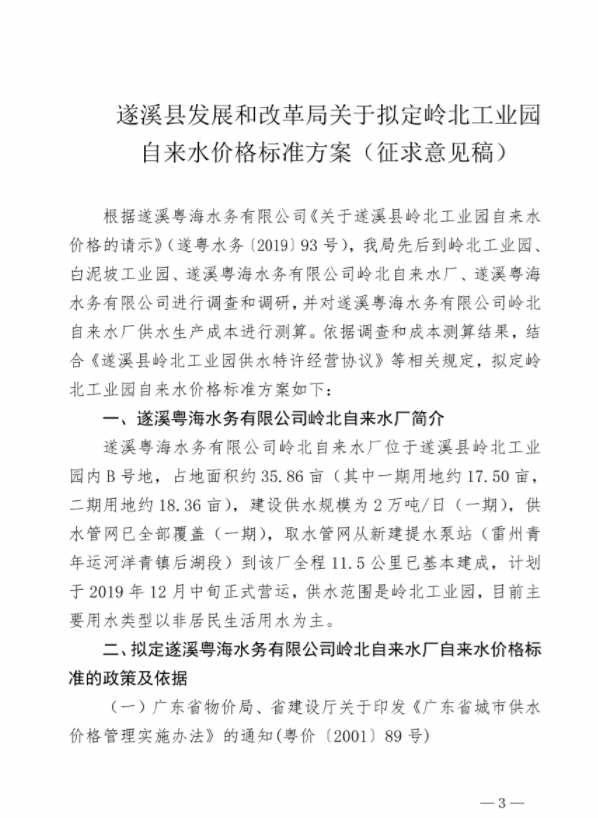 遂溪縣發(fā)展和改革局關(guān)于擬定嶺北工業(yè)園自來(lái)水價(jià)格標(biāo)準(zhǔn)方案征求意見(jiàn)公示的通知 | | 作者: | 來(lái)源:遂溪縣發(fā)改局 | 時(shí)間:2019-12-20 17:11:11 點(diǎn)擊數(shù):- 【打印正文】