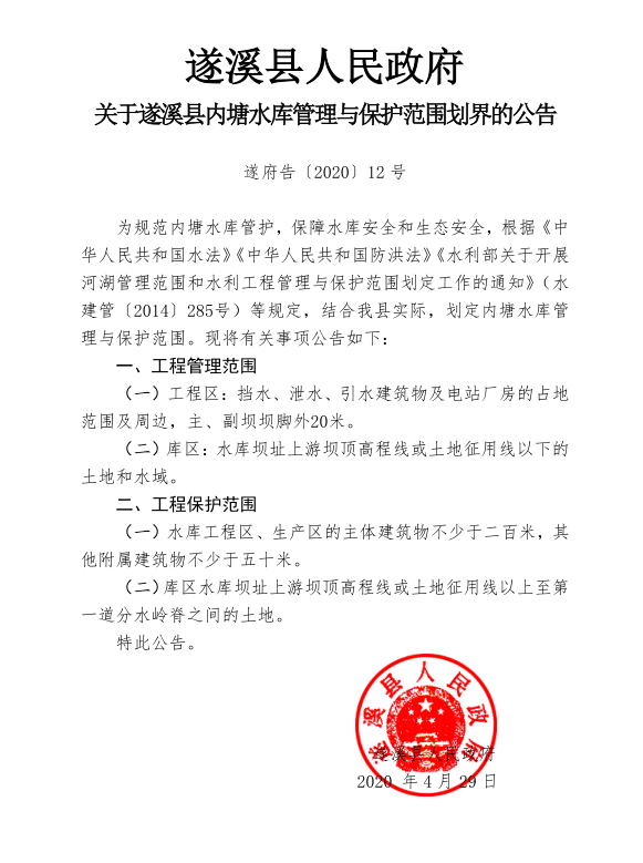 關(guān)于遂溪縣內(nèi)塘水庫管理與保護范圍劃界的公告