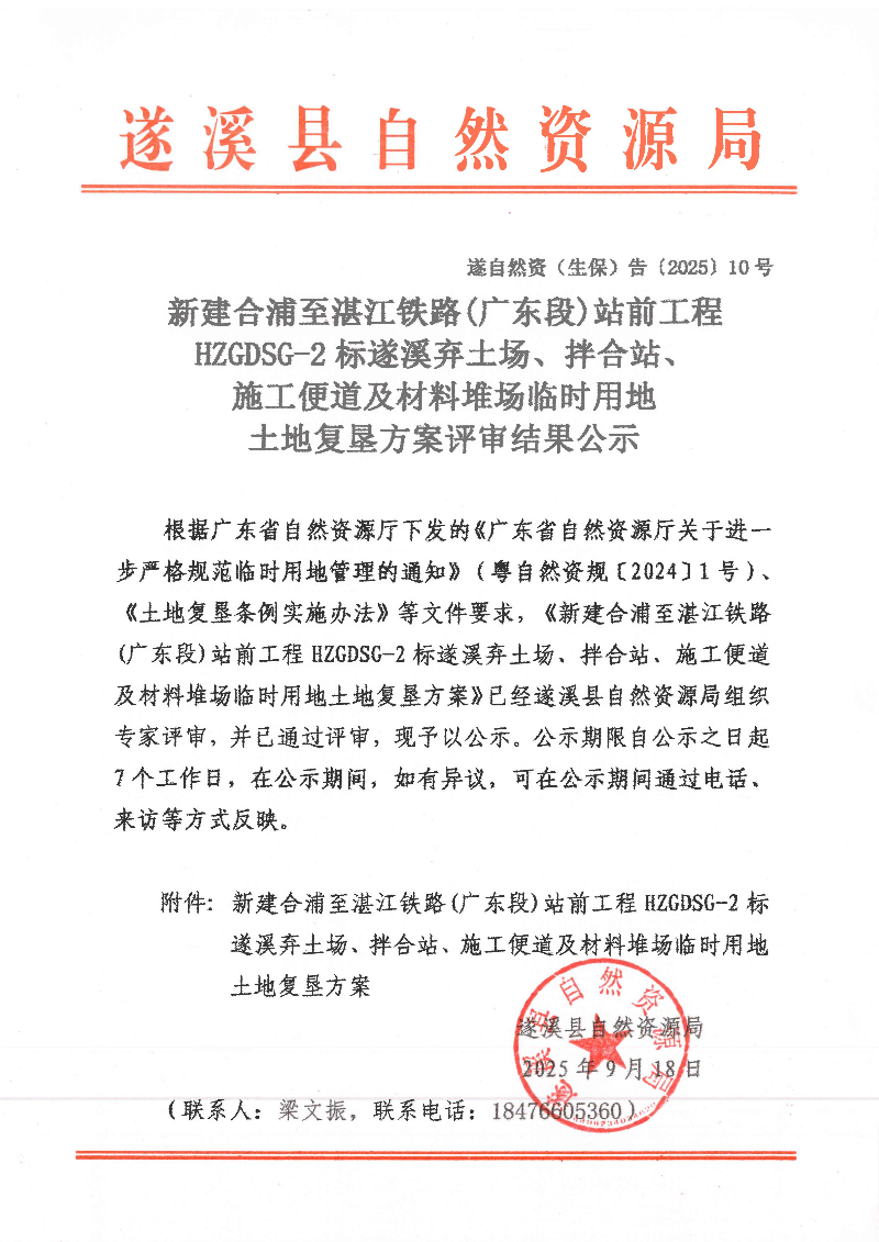 新建合浦至湛江鐵路(廣東段)站前工程HZGDSG-2標(biāo)遂溪棄土場(chǎng)、拌合站、施工便道及材料堆場(chǎng)臨時(shí)用地土地復(fù)墾方案評(píng)審結(jié)果公示 | | 作者: | 來(lái)源:遂溪縣自然資源局 | 時(shí)間:2025-09-18 15:57:12 點(diǎn)擊數(shù):- 附件:新建合浦至湛江鐵路(廣東段)站前工程HZGDSG-2標(biāo)遂溪棄土場(chǎng)、拌合站、施工便道及材料堆場(chǎng)臨時(shí)用地土地復(fù)墾方案 【打印正文】