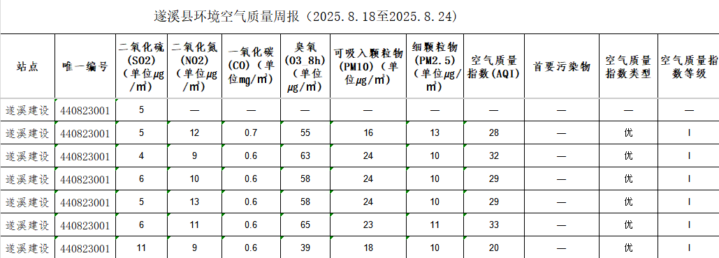 遂溪縣環(huán)境空氣質量周報(2025.8.18至2025.8.24) | | 作者: | 來源:湛江市生態(tài)環(huán)境局遂溪分局 | 時間:2025-08-25 09:14:58 點擊數:- 【打印正文】