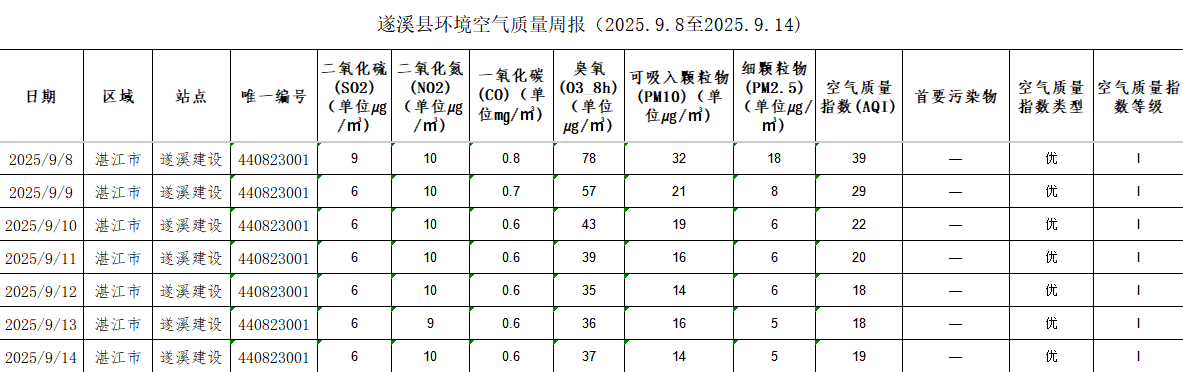 遂溪縣環(huán)境空氣質(zhì)量周報(bào)(2025.9.8至2025.9.14) | | 作者: | 來(lái)源:湛江市生態(tài)環(huán)境局遂溪分局 | 時(shí)間:2025-09-15 10:30:40 點(diǎn)擊數(shù):- 【打印正文】