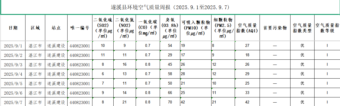 遂溪縣環(huán)境空氣質(zhì)量周報(bào)(2025.9.1至2025.9.7) | | 作者: | 來源:湛江市生態(tài)環(huán)境局遂溪分局 | 時(shí)間:2025-09-09 10:32:38 點(diǎn)擊數(shù):- 【打印正文】