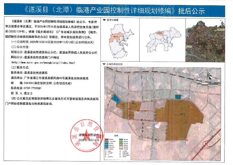 《遂溪縣(北潭)臨港產(chǎn)業(yè)園控制性詳細規(guī)劃修編》批后公示 | | 作者: | 來源:遂溪縣自然資源局 | 時間:2025年-10月-14日 點擊數(shù) 分享到: 【打印正文】